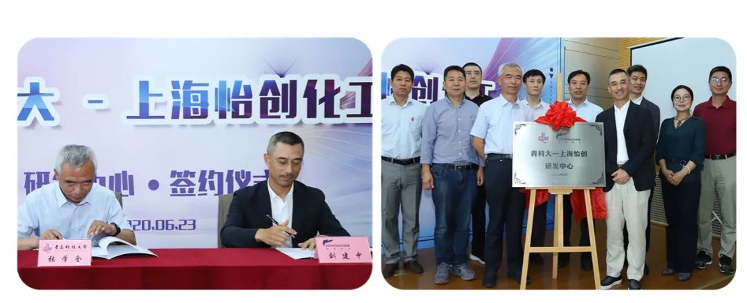 2020年06月23日,青島科技大學(簡稱“青科大”)&上海怡創化工研發中心揭牌簽約儀式在青科大四方校區召開,青科大聚合物合成團隊張學全教授、張春雨教授,青科大科技處處長李再峰,青科大高分子科學與工程學院院長閆業海,青科大橡塑材料與工程省部共建教育部重點實驗室執行主任張建明、副主任史新妍、劉偉,怡創化工董事長劉建中,怡創化工副總經理張宇芳,怡創化工副總經理宋照仁等相關領導出席簽約儀式。